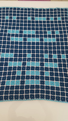 Kocyk jest niewielki, 19x23 części, 70x90cm. Struktura jest dokładnie taka sama jak w poprzednim kocyku - robione oddzielnie małe elementy, zszyte potem według przygotowanego wcześniej schematu - zgodnie z wytycznymi alfabetu Morse'a długie linie/znaki/sygnały muszą być trzy razy dłuższe niż te krótkie. Podzieliłam kocyk tak, aby każde słowo było wyraźnie oddzielone od innych, stąd trzy paski ciemnoniebieskiego pomiędzy liniami z literami. Także tutaj wypośrodkowałam tekst. Brzeg bardzo prosty - jeden rządek raczkiem w jasnoniebieskim.